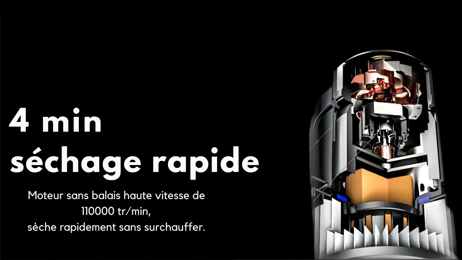 Le flux d’air est optimisé pour produire un jet contrôlé et à haute vitesse, garantissant un séchage rapide.