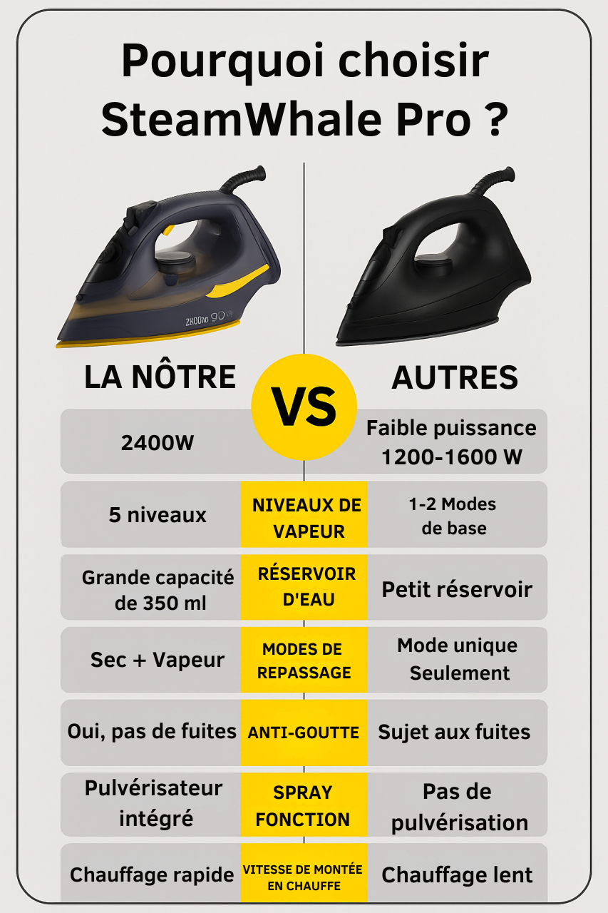 Avec une puissance de chauffe de 2400 W, le SteamWhale Pro diffuse un puissant jet de vapeur qui pénètre en profondeur dans les tissus. Les plis tenaces disparaissent rapidement, laissant les vêtements lisses et frais avec un minimum d'effort.